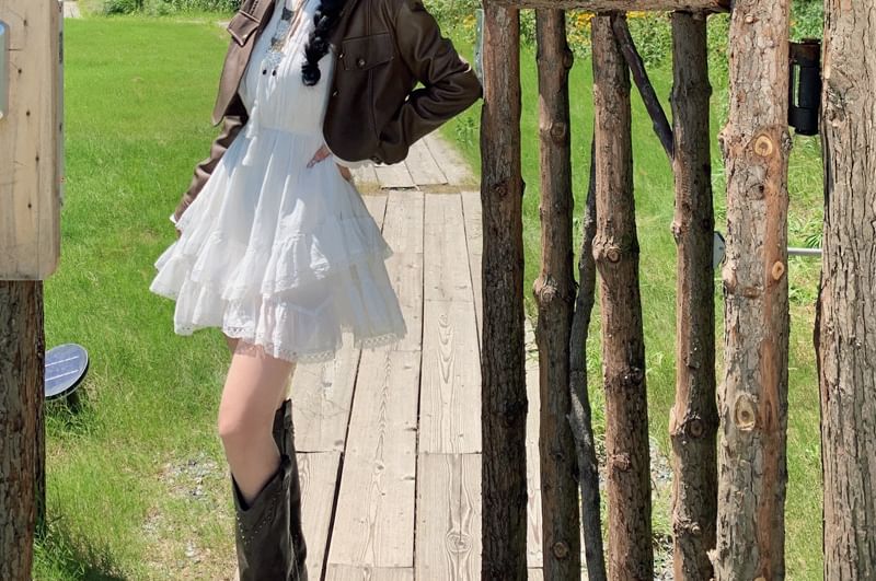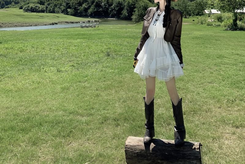Long-Sleeve Plain Lace Trim Tiered Mini A-Line Dress