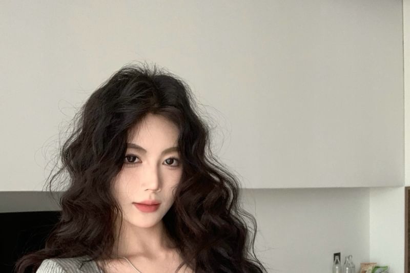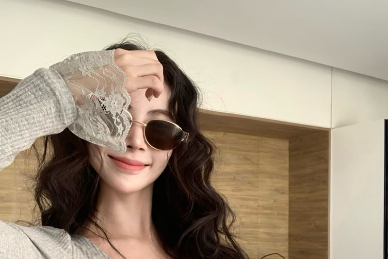Long-Sleeve Scoop Neck Lace Trim Crop Button Slim Fit Top