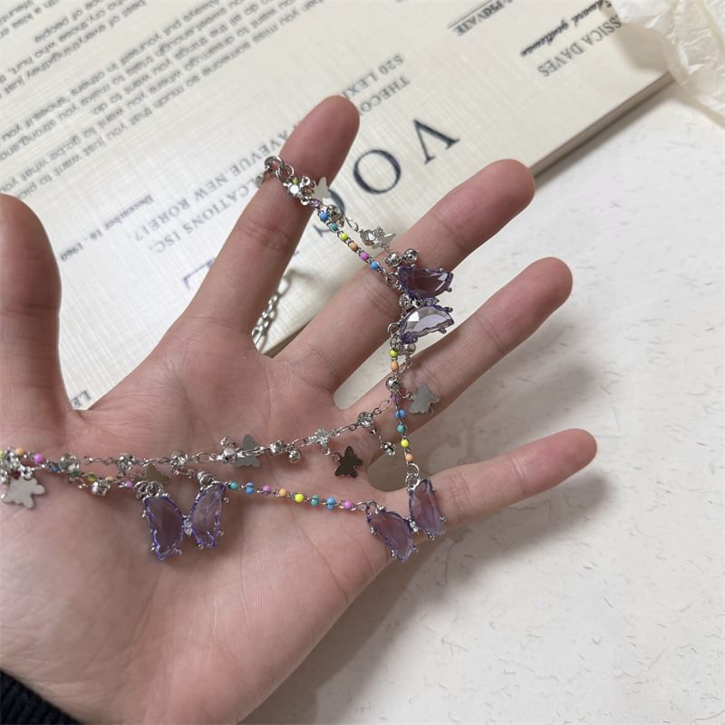 Butterfly Faux Crystal Fringed Layered Necklace