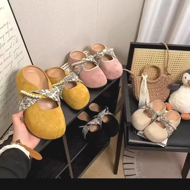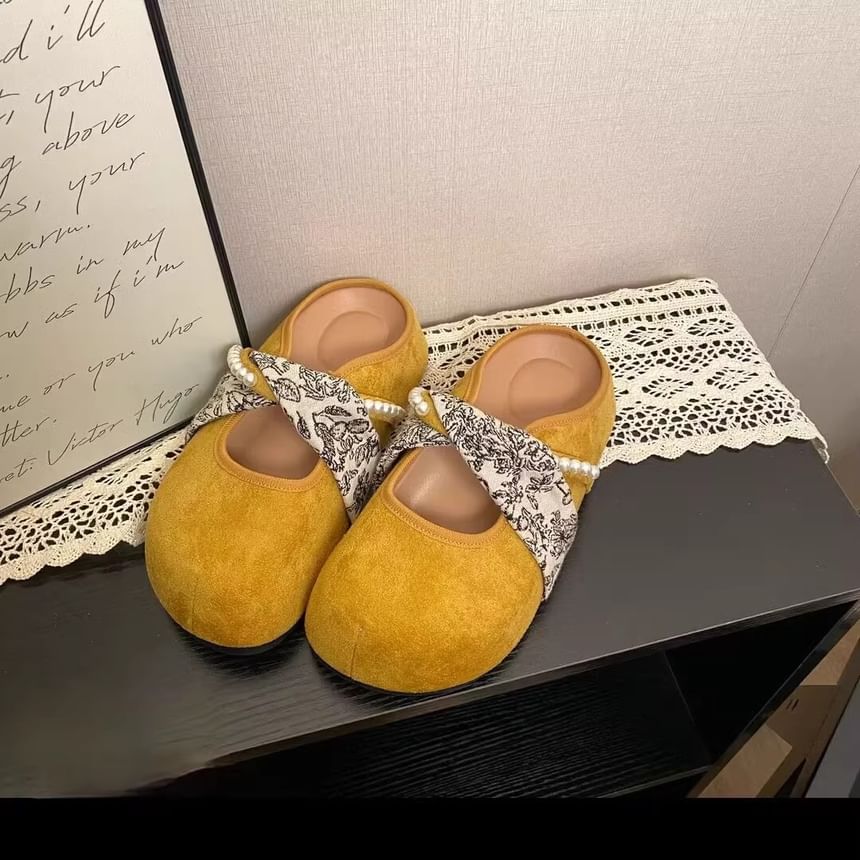 Floral Print Faux Pearl Panel Mary Jane Mules