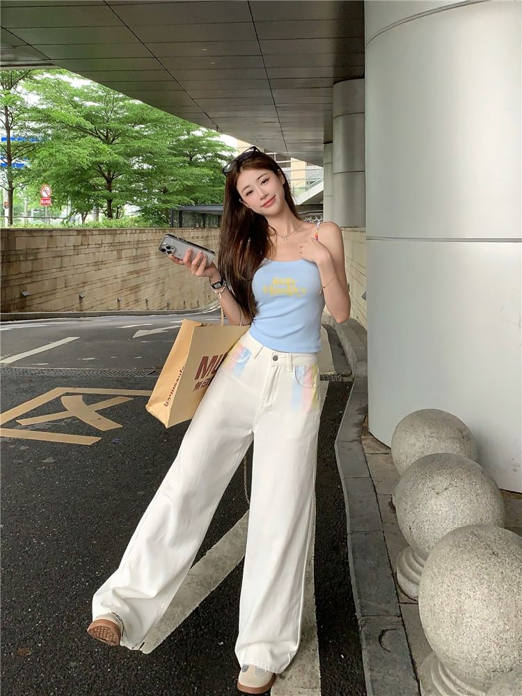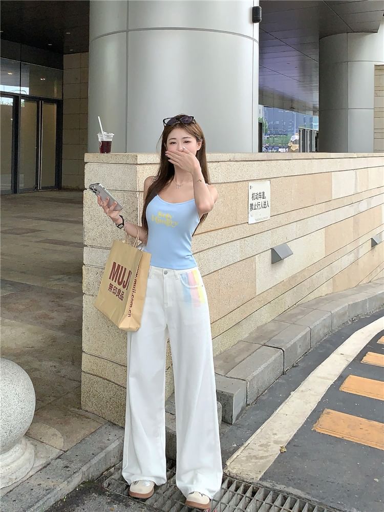 Scoop Neck Lettering Print Beaded Crop Cami Top