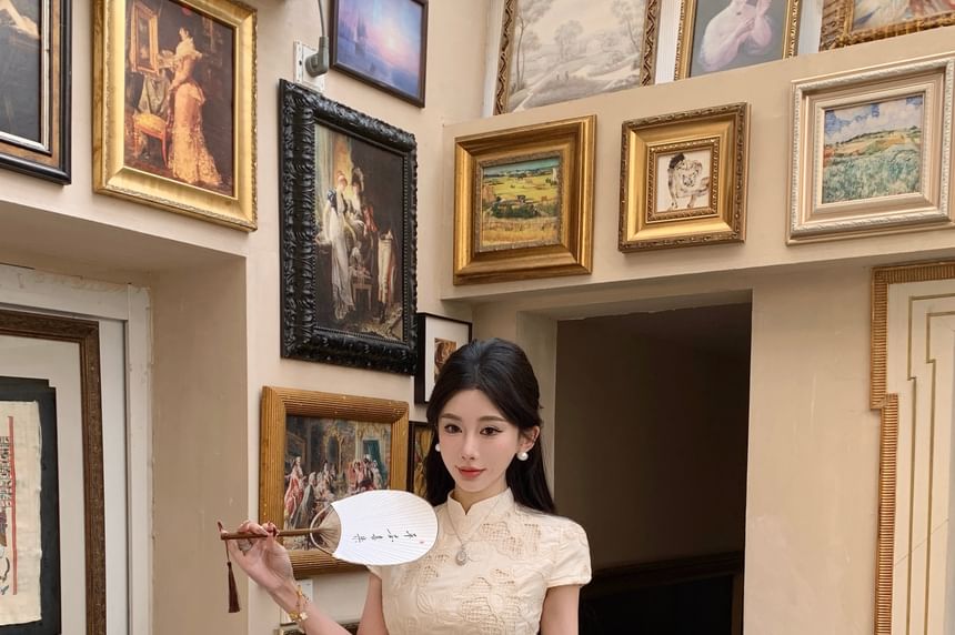 Short-Sleeve Stand Collar Lace Midi Sheath Qipao Dress