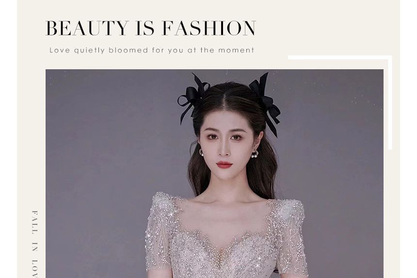 Short-Sleeve V-Neck Trained Mermaid Evening Gown