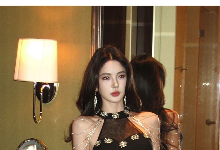 Sleeveless Crew Neck Plain Rhinestone Chained Panel Mesh Trumpet Evening Dress