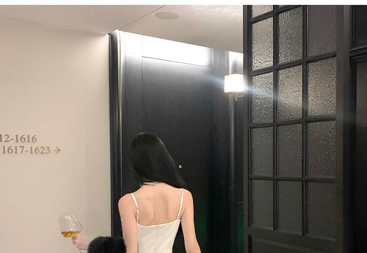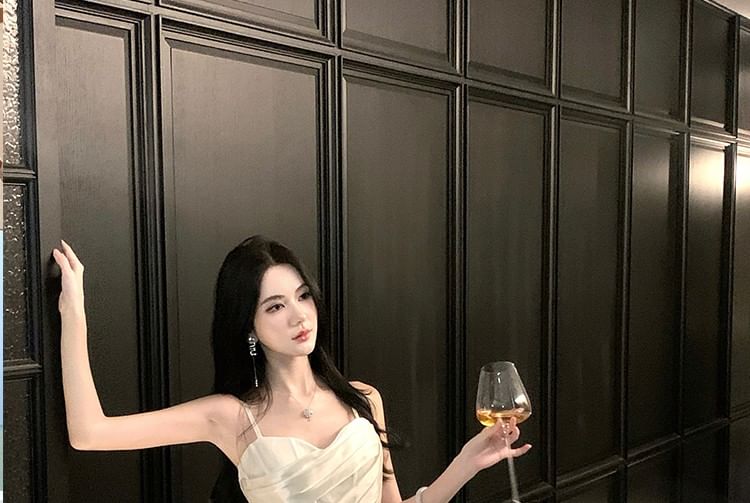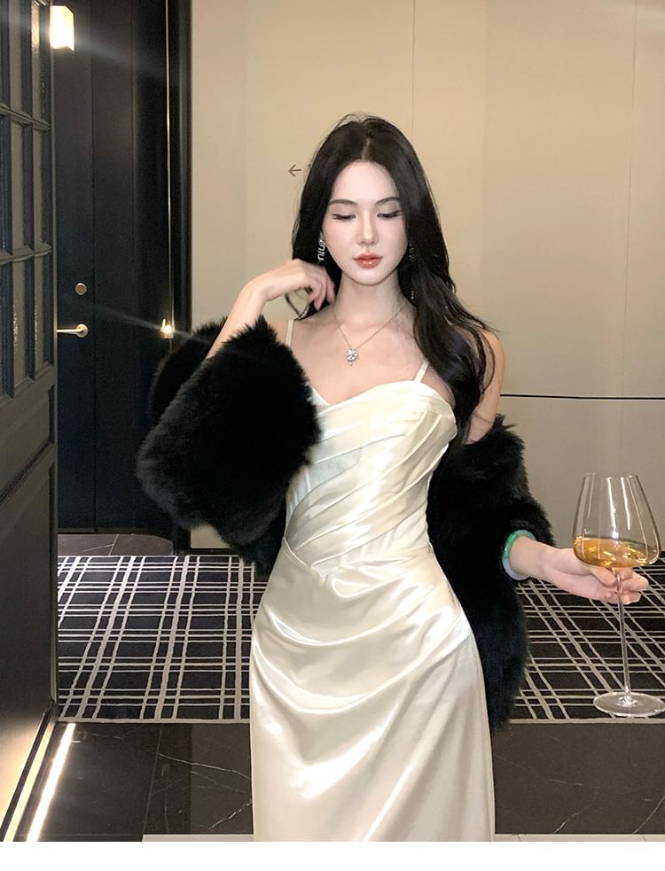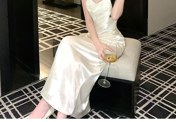 Spaghetti Strap Plain Ruched Satin Sheath Evening Dress