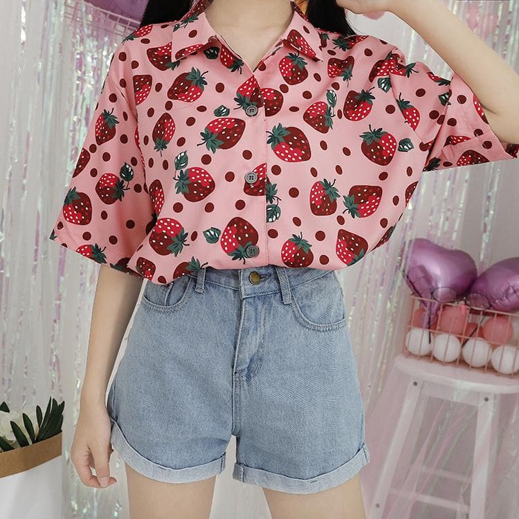 This charming Pink Kawaii Strawberry Blouse will add a touch of sweetness to your wardrobe. The delicate pink color and adorable strawberry design make this blouse perfect for any kawaii fashion lover. Made with high-quality materials, it is soft and comfortable to wear while still being stylish. Bring a pop of cuteness to any outfit with this blouse.