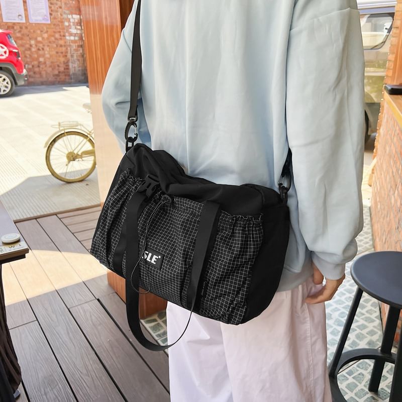Plaid Panel Drawstring Buckled Crossbody Bag