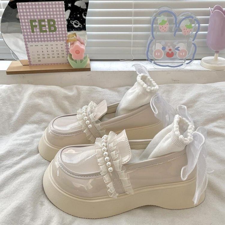 Platform Faux Pearl Accent Frill Trim Patent Leather Loafers