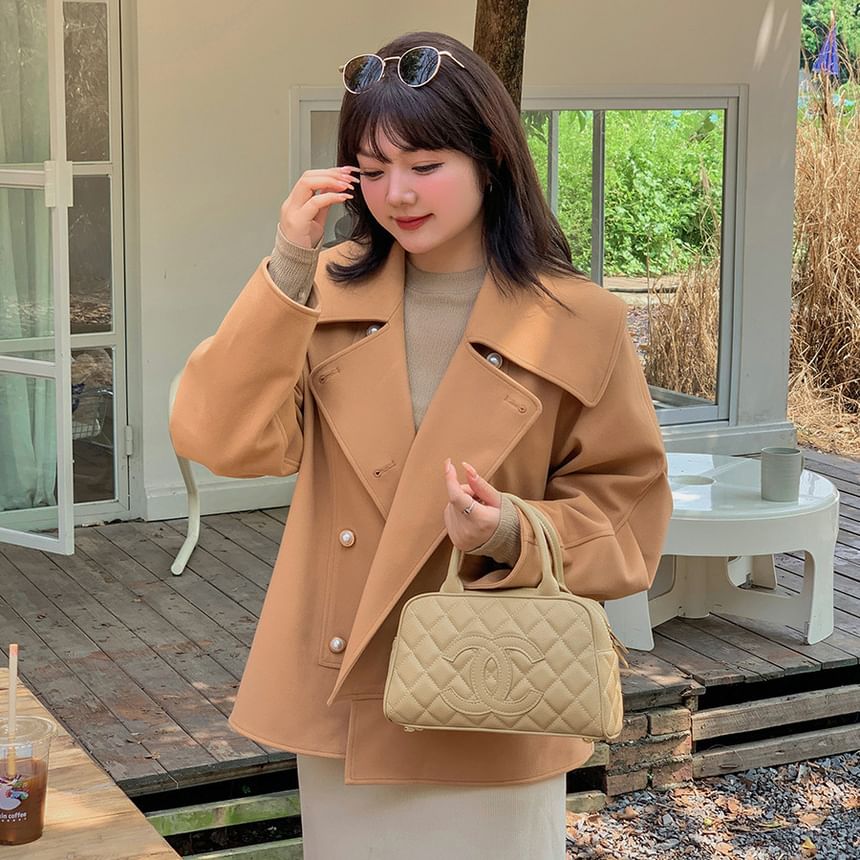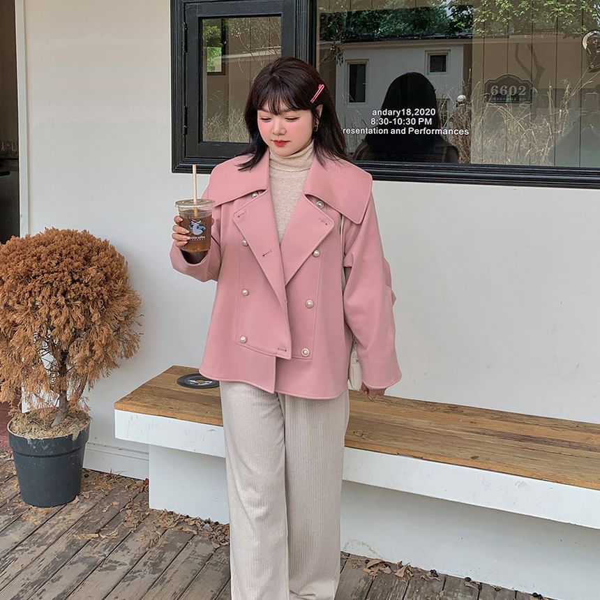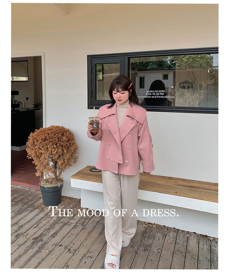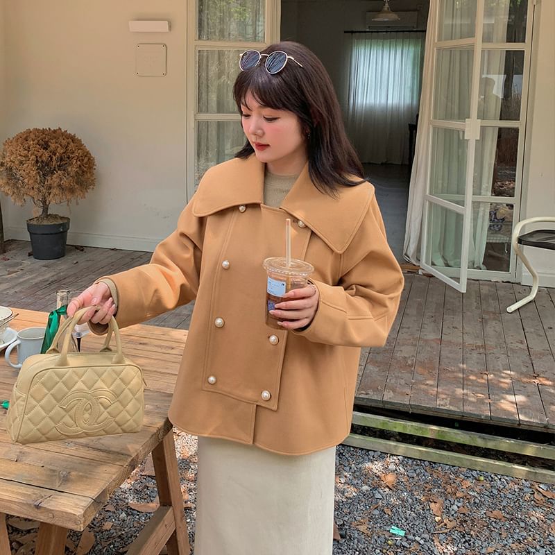Plus Size Collared Plain Faux Pearl Button Double Breasted Jacket