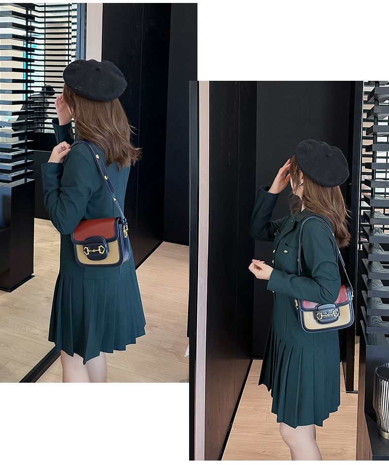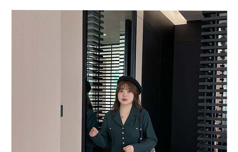 Plus Size Long Sleeve Collared Plain Pleated Button Mini A-Line Dress