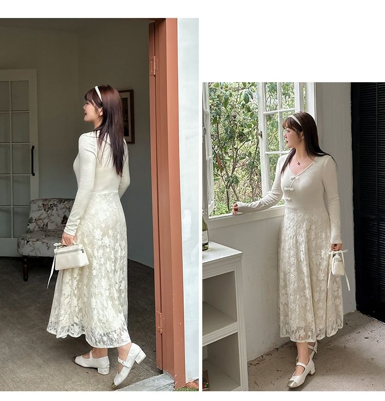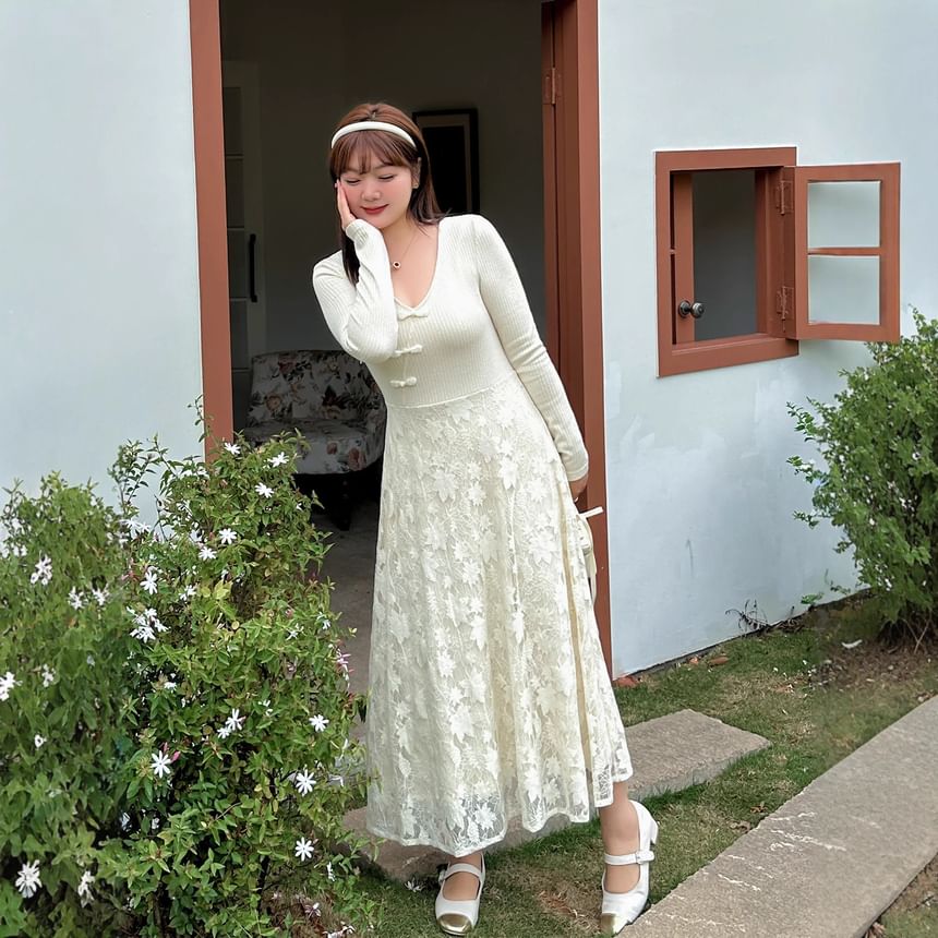 Plus Size Long-Sleeve V-Neck Lace Panel Frog Buttoned Midi A-Line Dress