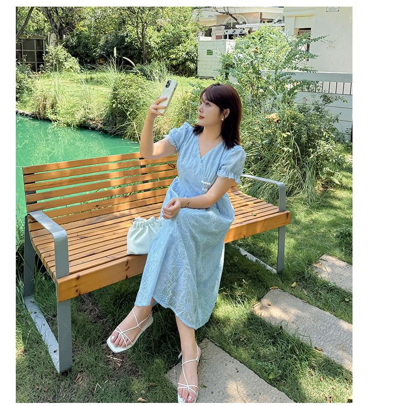 Plus Size Short Sleeve V-Neck Floral Embroidered Midi A-Line Dress