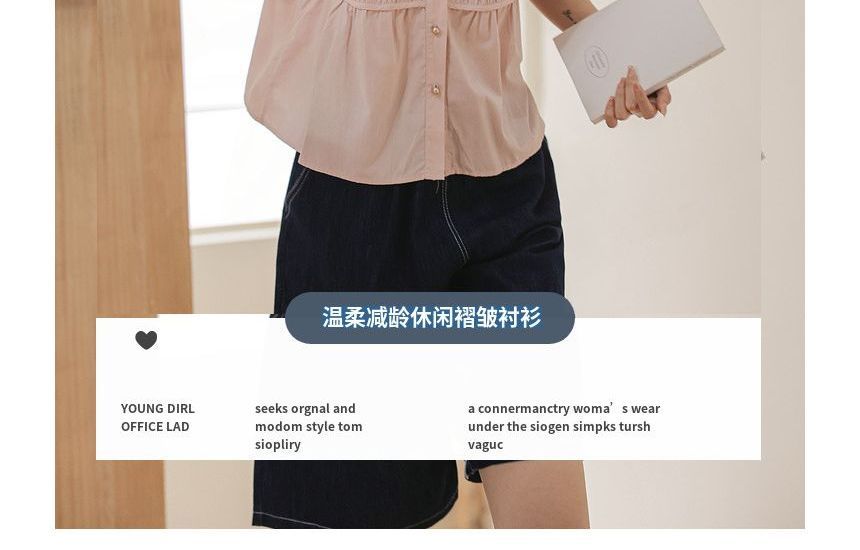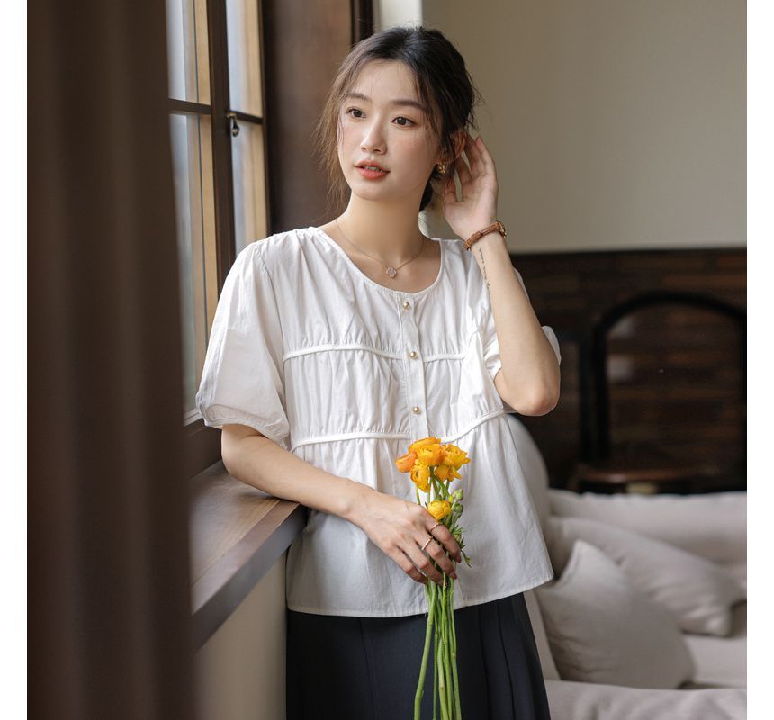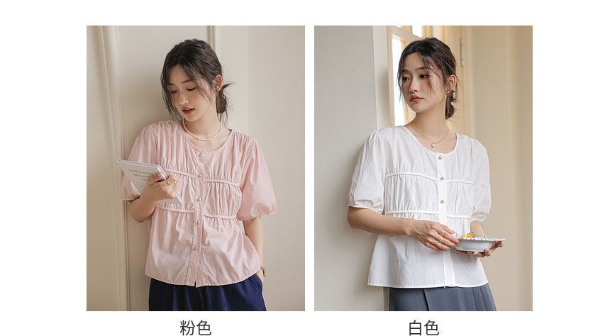 Puff-Sleeve Plain Shirred Faux Pearl Buttoned Blouse