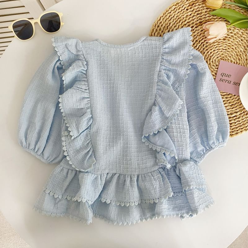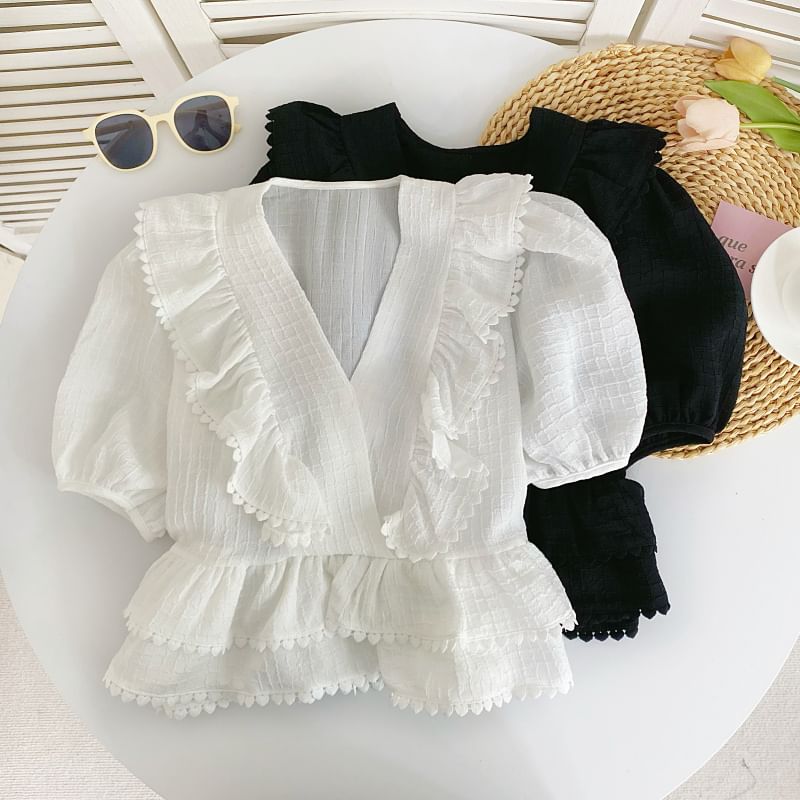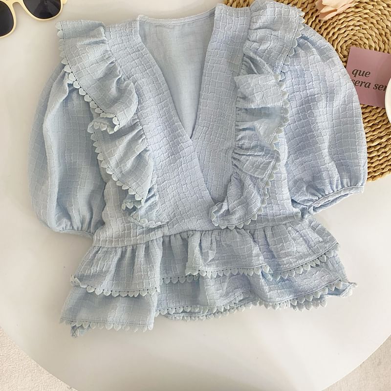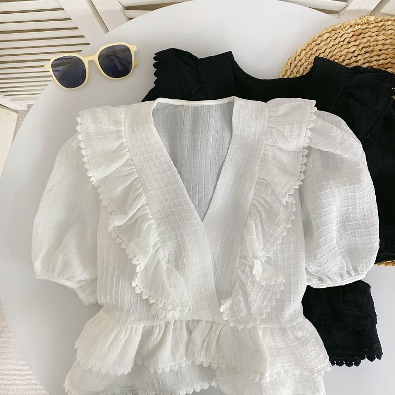 Puff Sleeve V-Neck Plain Ruffle Blouse