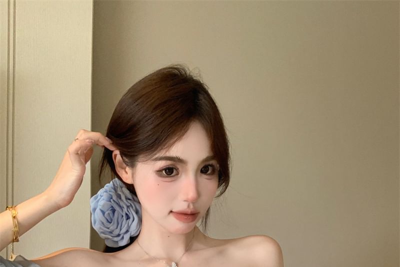 Puff-Sleeve Off-Shoulder Plain Ruffle Rhinestone Blouse
