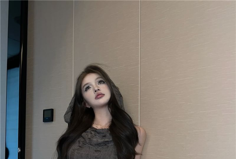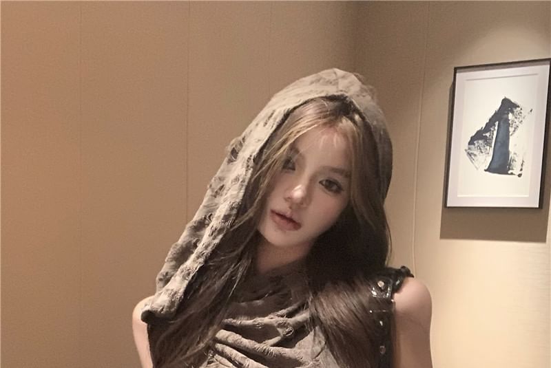 Set: Cowl Neck Plain Distressed Hooded Slim Fit Crop Tank Top + Long Gloves