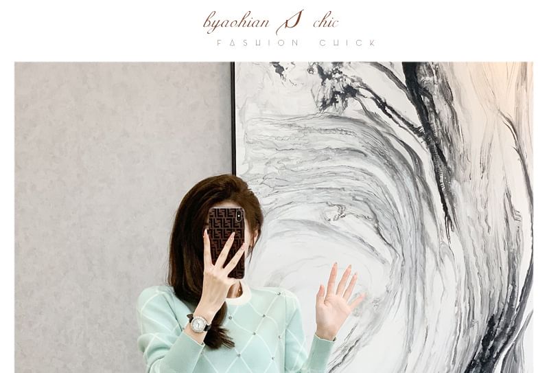 Set: Crew Neck Plaid Rhinestone Sweater + High Waist Mini A-Line Skirt
