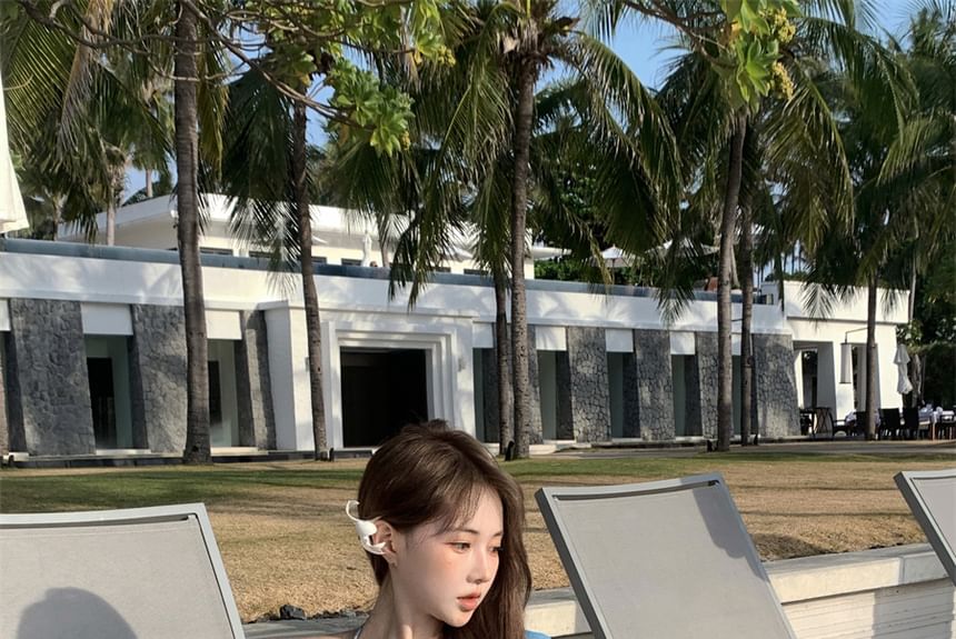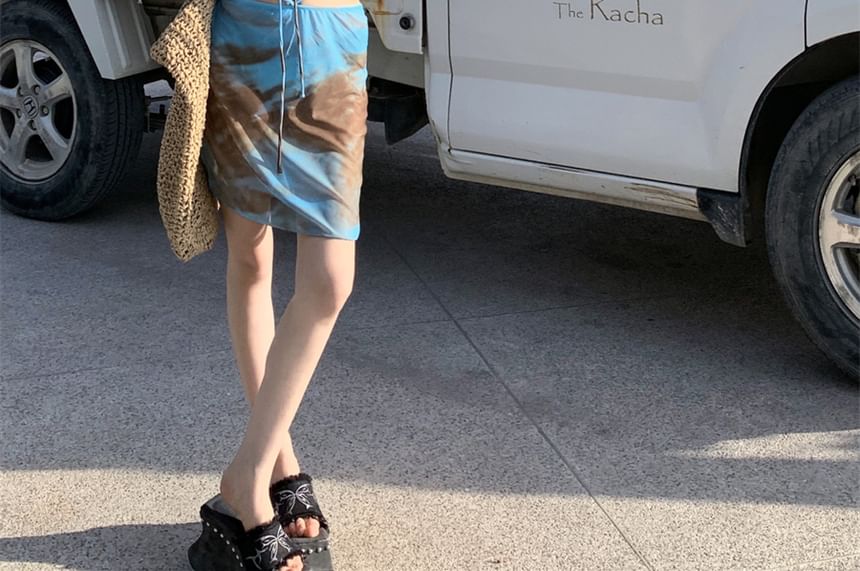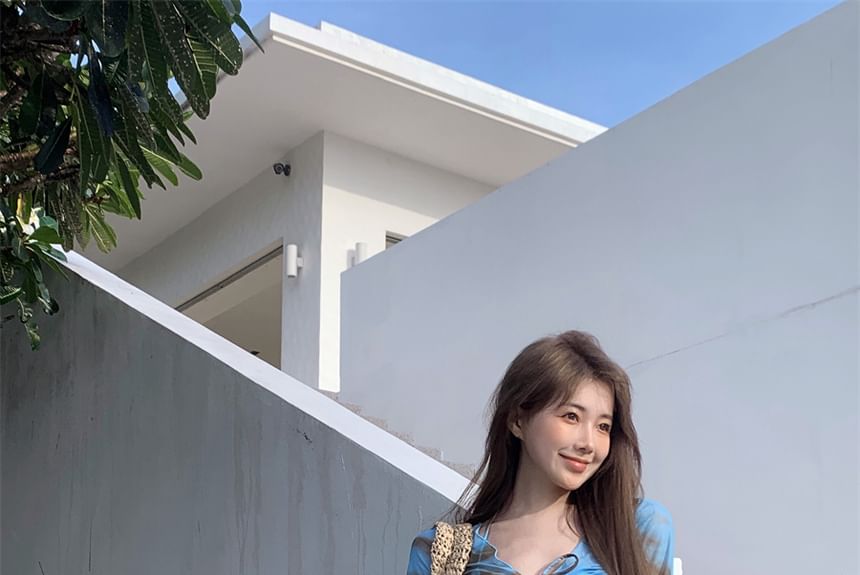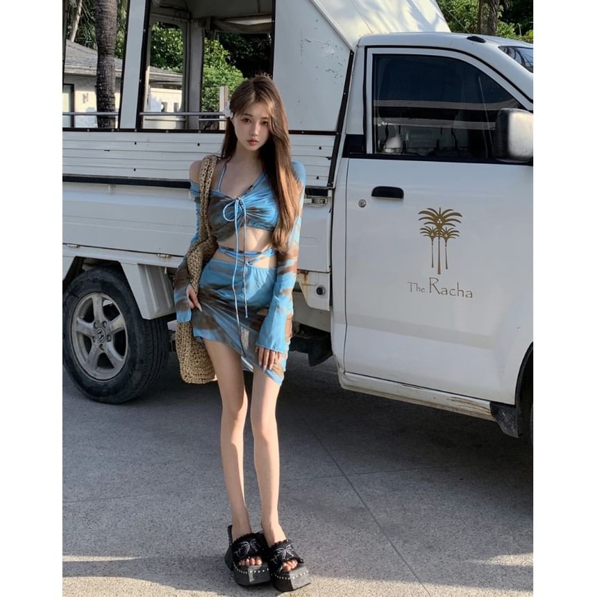 Set: Long-Sleeve Tie Dye Crop Top + Halter Bikini Top + Bikini Bottom + Cover Up