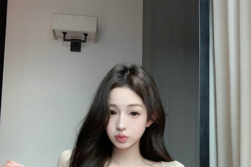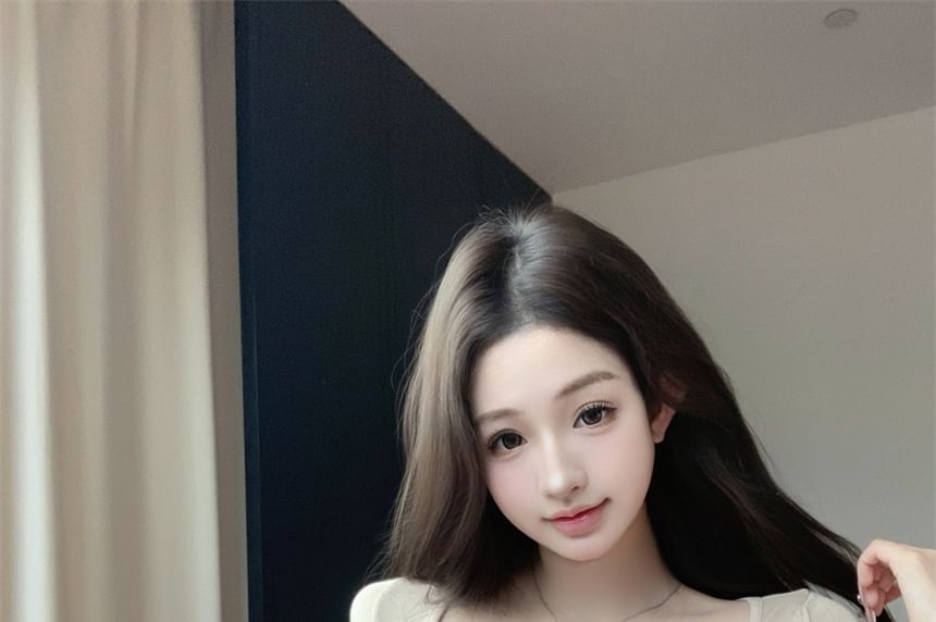 Set: Long-Sleeve Henley Plain Crop Slim Fit T-Shirt + Lace Camisole Top