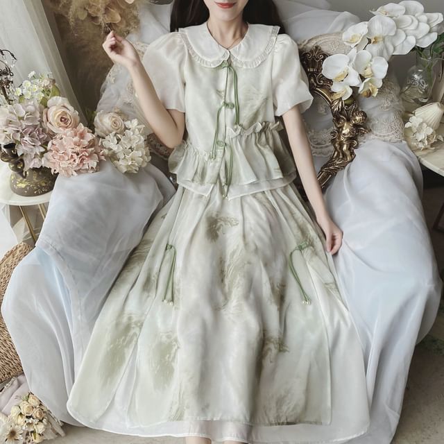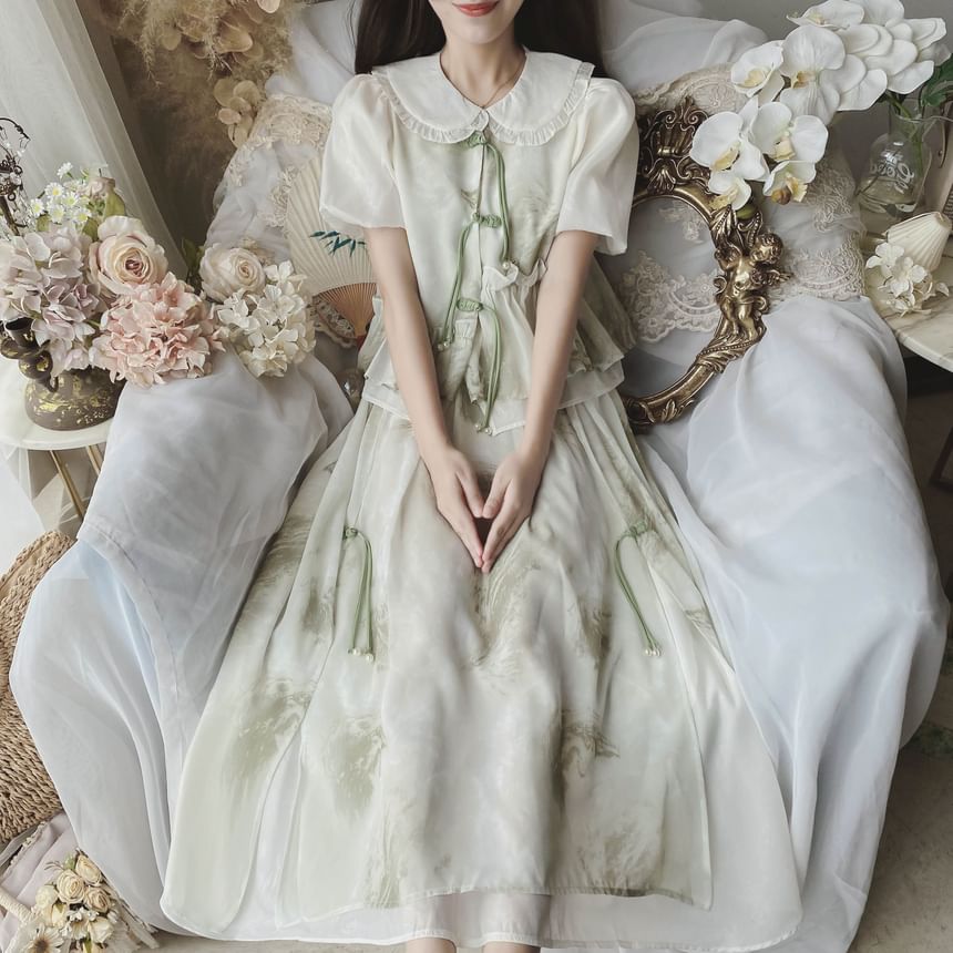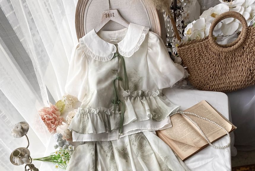 | Color: | Set - Blouse & Skirt - White & Green & Light Gray |