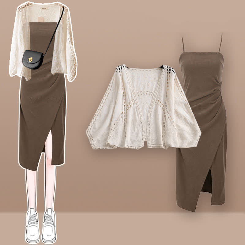 Set Split Ruffled Dress Out Slip Hollow Cardigan