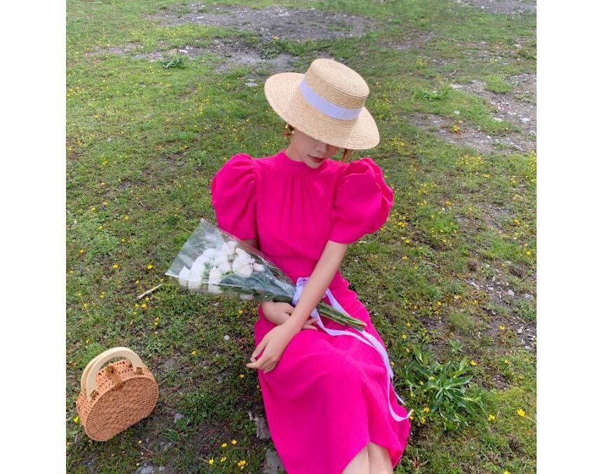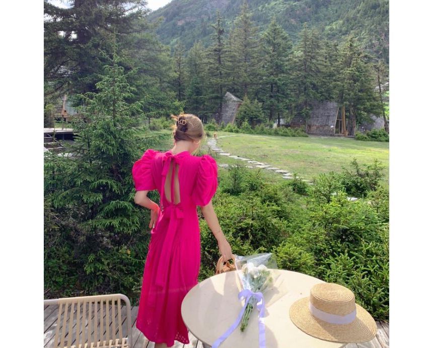 Short-Sleeve Open Back Plain Midi A-Line Dress