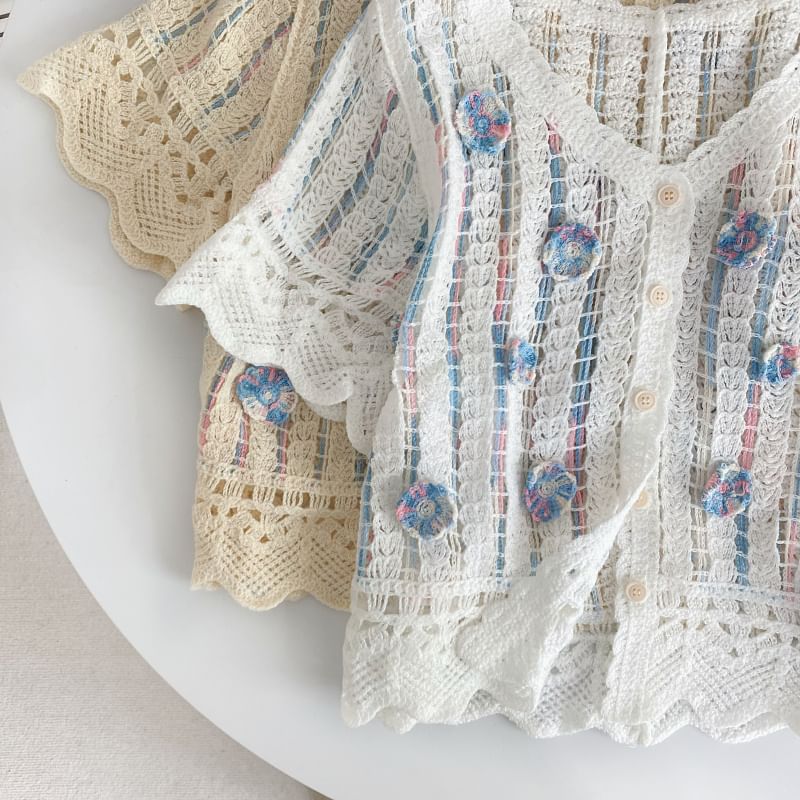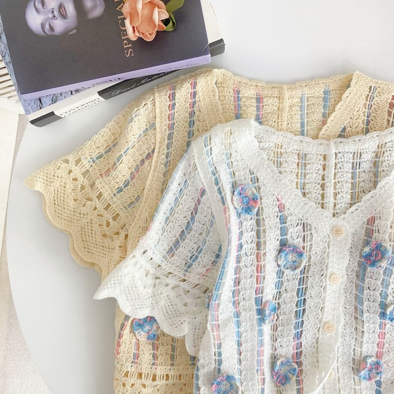 Short-Sleeve V-Neck Flower Detail Crochet Cardigan