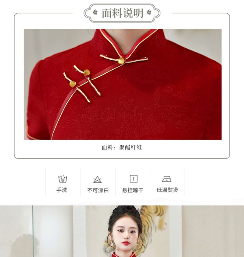 Short-Sleeve Floral Print Maxi Sheath Qipao Dress