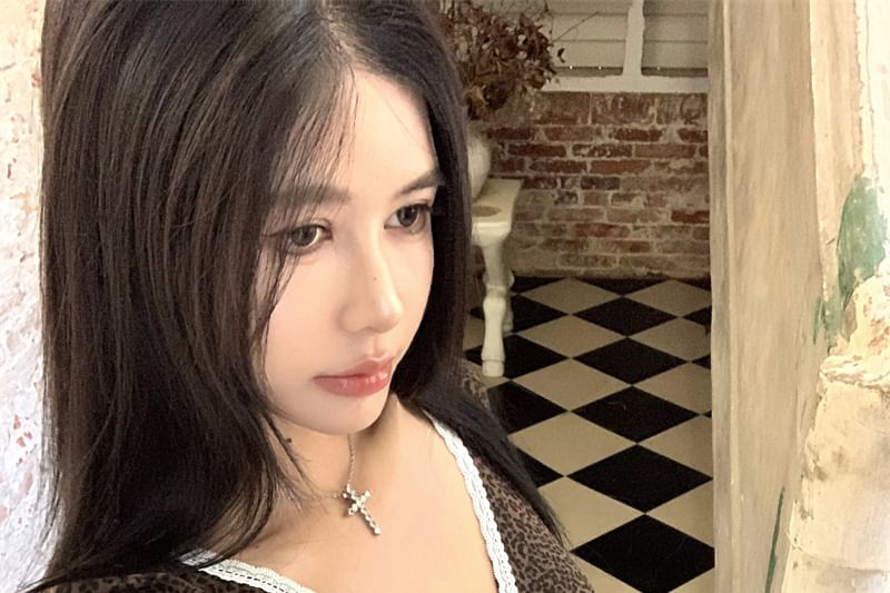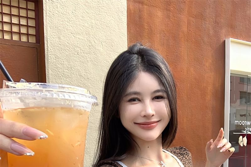 Short-Sleeve V-Neck Print Lace Trim Slim Fit Tee