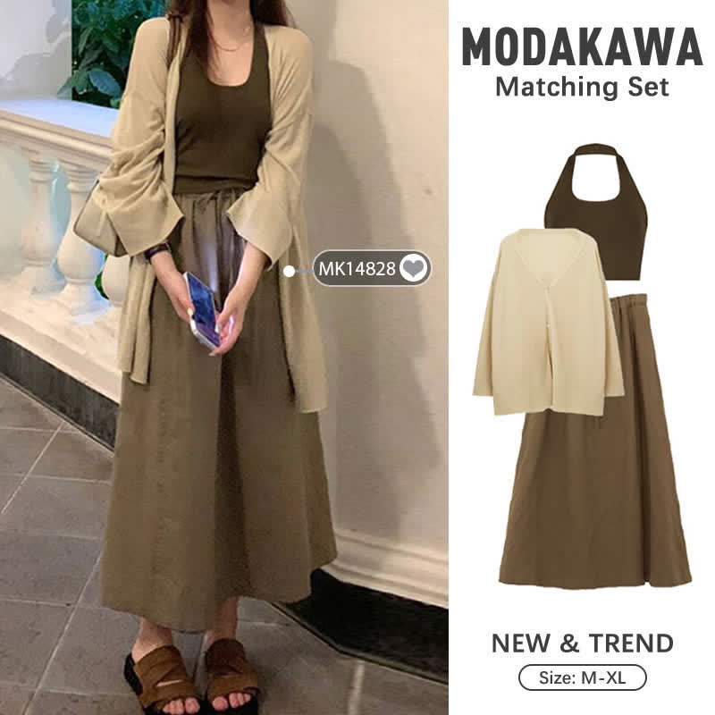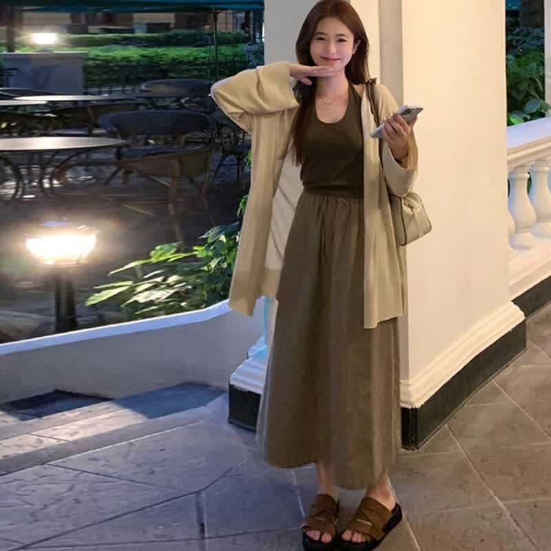 V-neck Cardigan Halter Cami Top High Waist Skirt