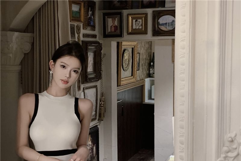 Sleeveless Crew Neck Two Tone Knit Maxi Sheath Dress