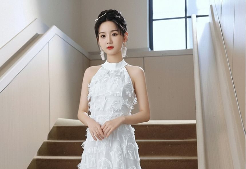 Sleeveless Mock Neck Plain Fringe A-Line Evening Dress