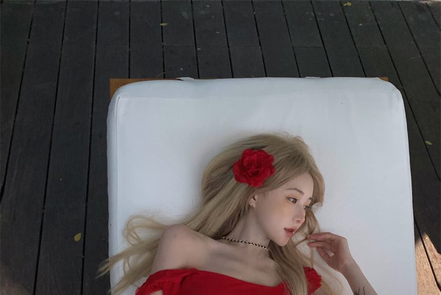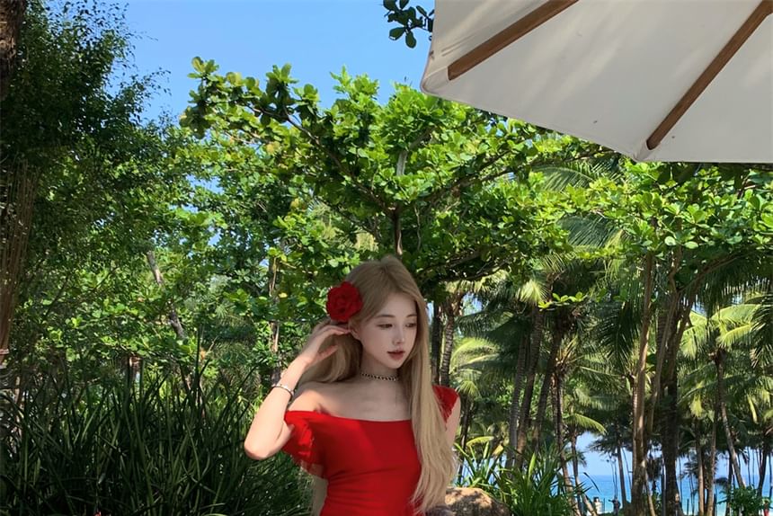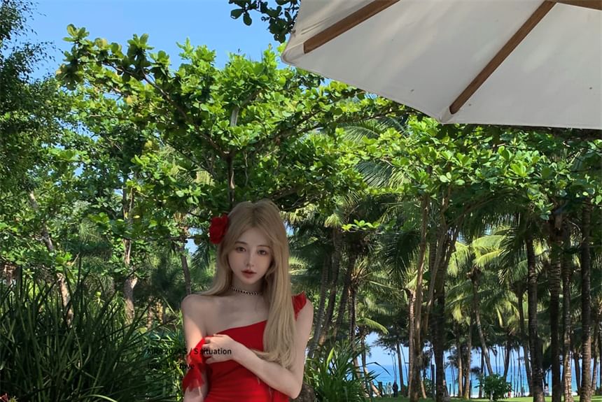 Sleeveless Plain Asymmetrical Slit Ruffle Trim Midi Sheath Dress