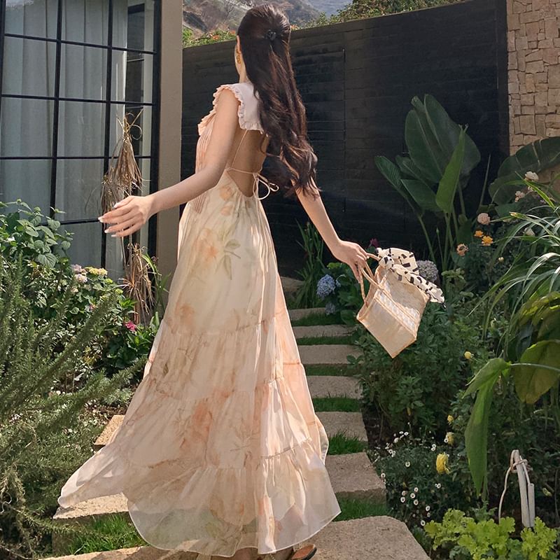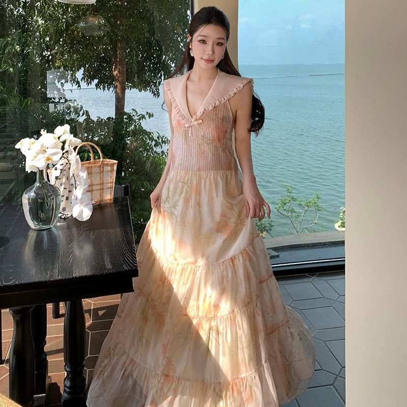 Sleeveless Sailor Collar Floral Open Back Tiered Mesh Maxi A