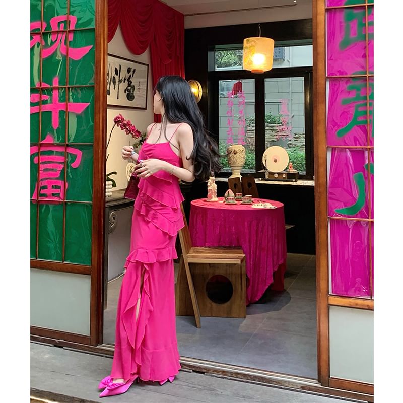 Spaghetti Strap Asymmetrical Plain Ruffled Midi A-Line Dress