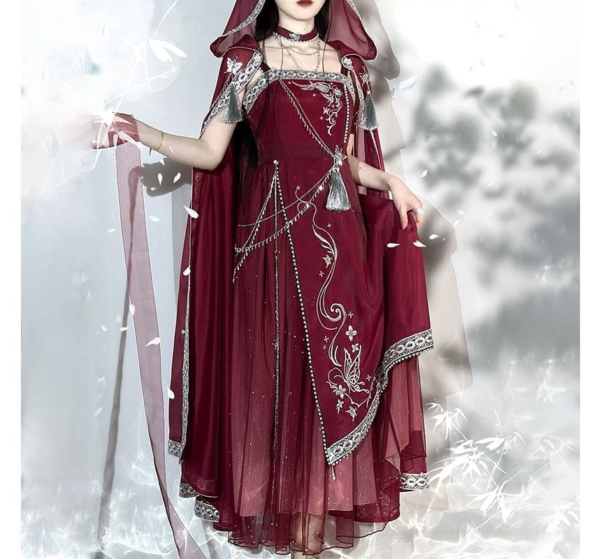 Lolita Spaghetti Strap Embroidered Hanfu Midi A-Line Dress / Light Cape / Set
