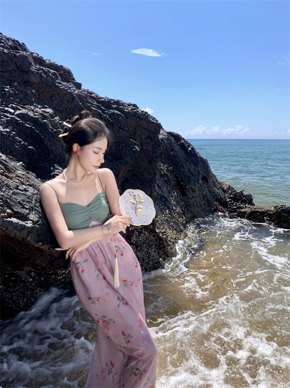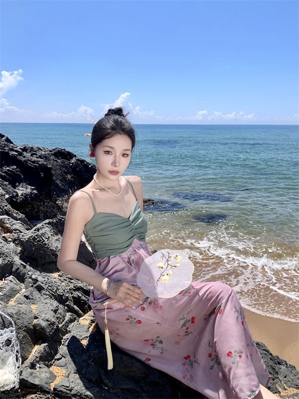 Spaghetti Strap Floral Print Paneled Shirred Midi Sundress