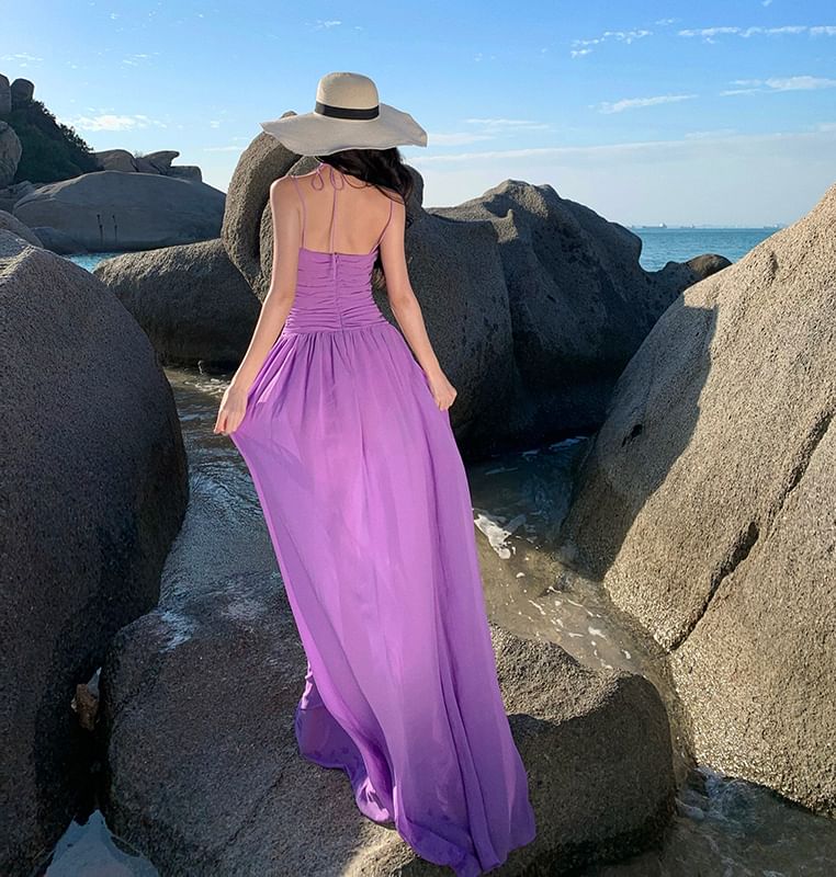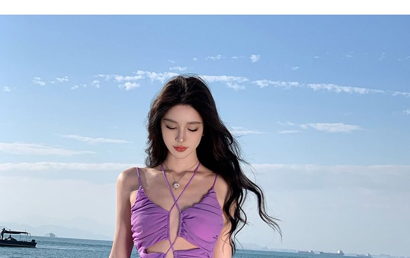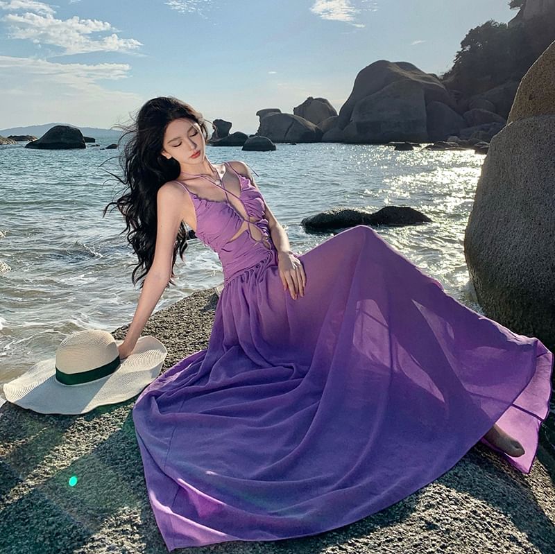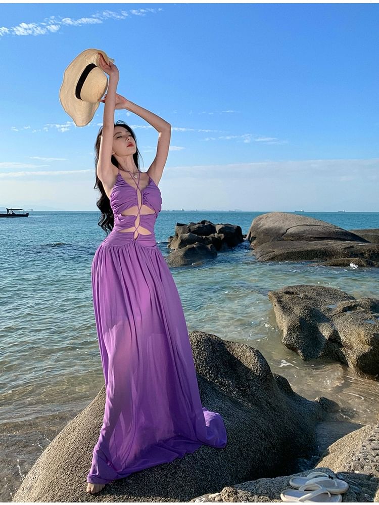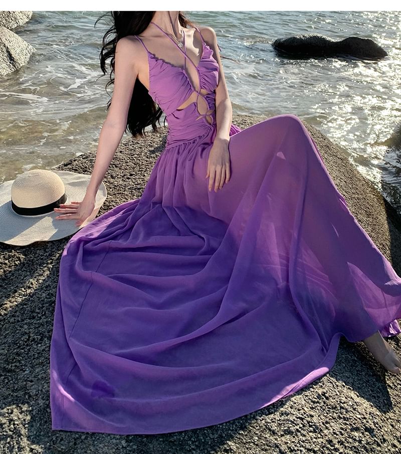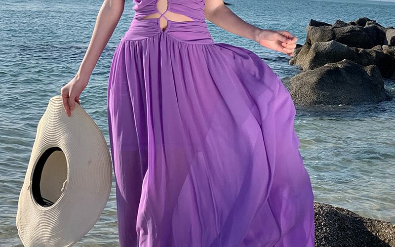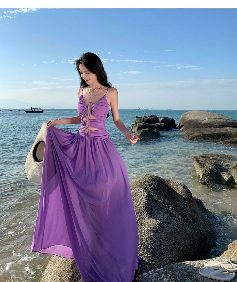 Spaghetti Strap Plain Cutout Ruched Maxi A