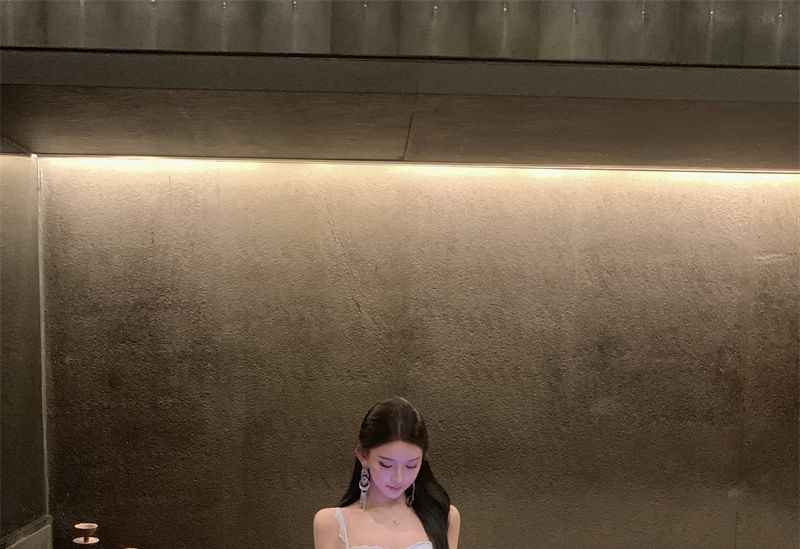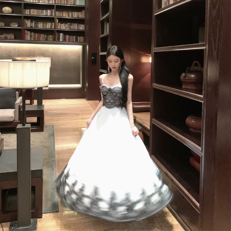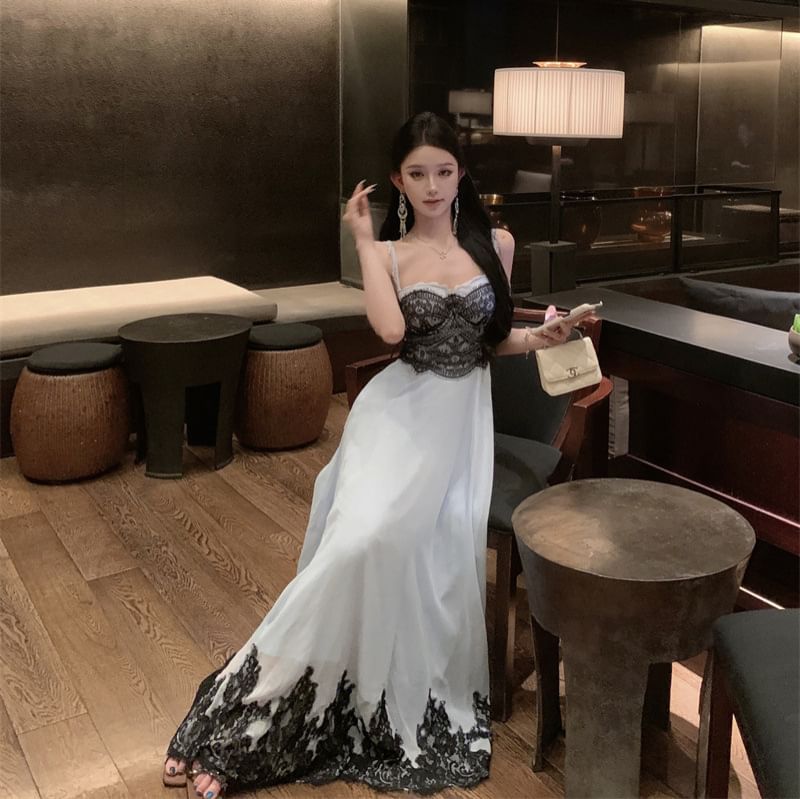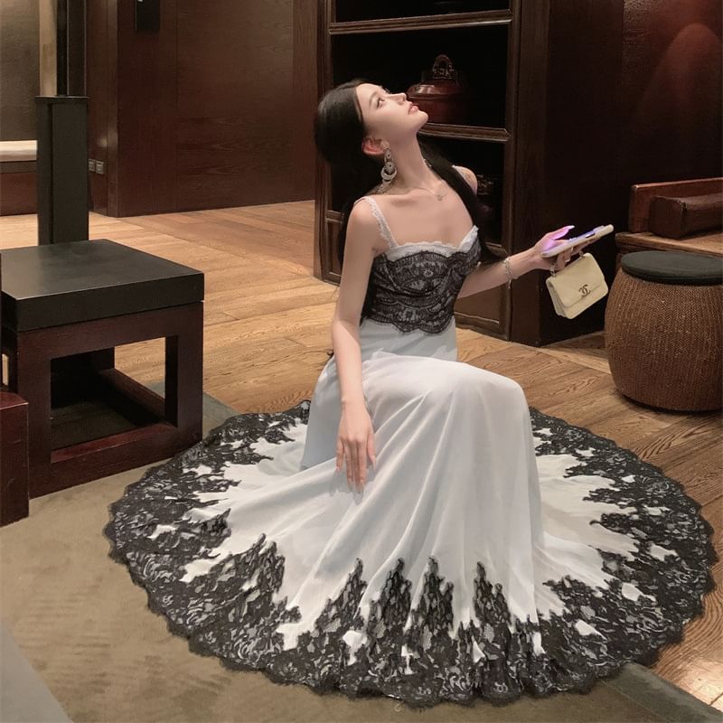 Spaghetti Strap Plain Lace Trim A-Line Evening Dress