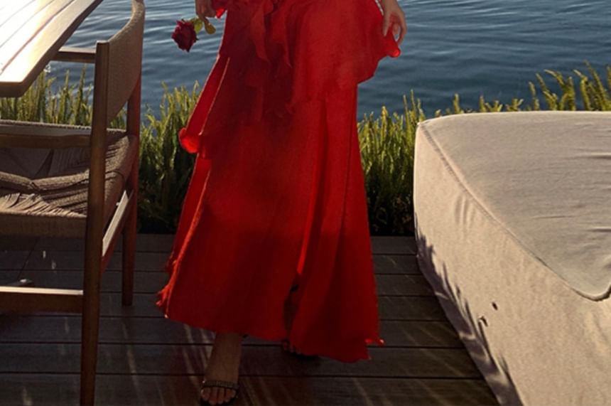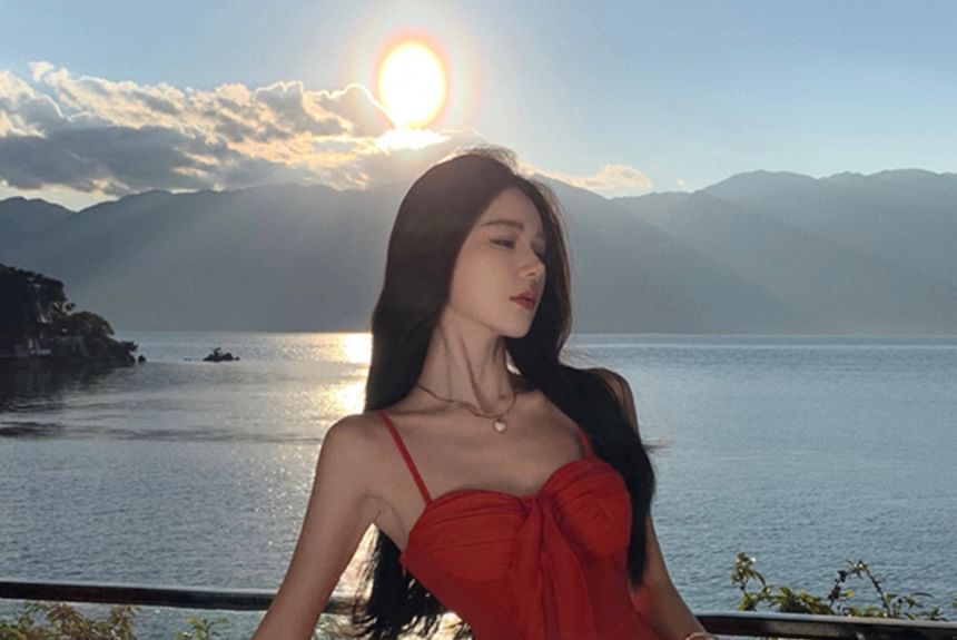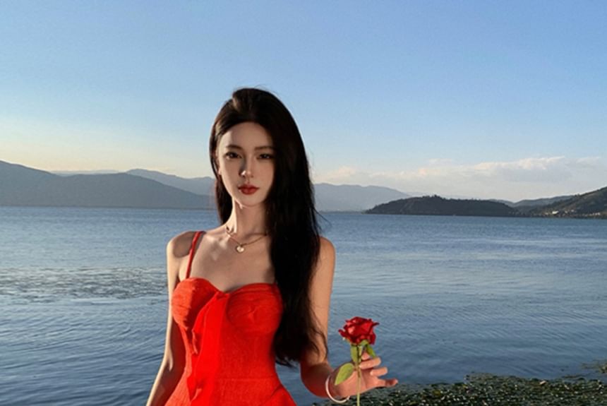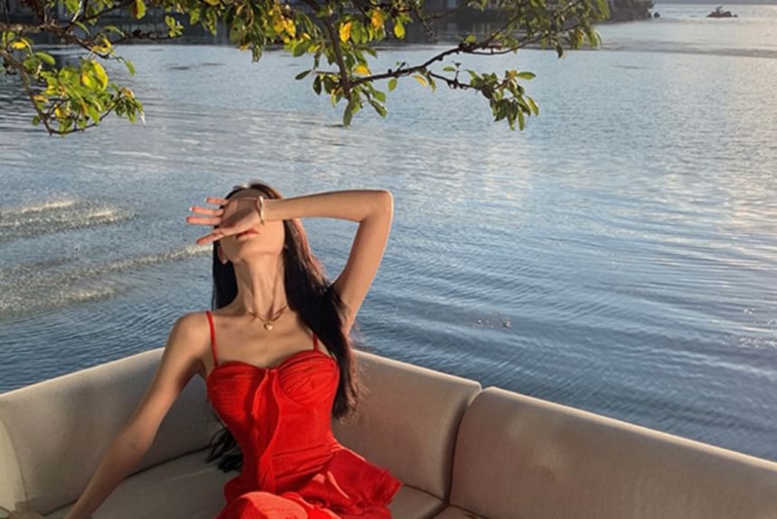 Spaghetti Strap Plain Ruffle Tiered Slit Maxi A-Line Dress