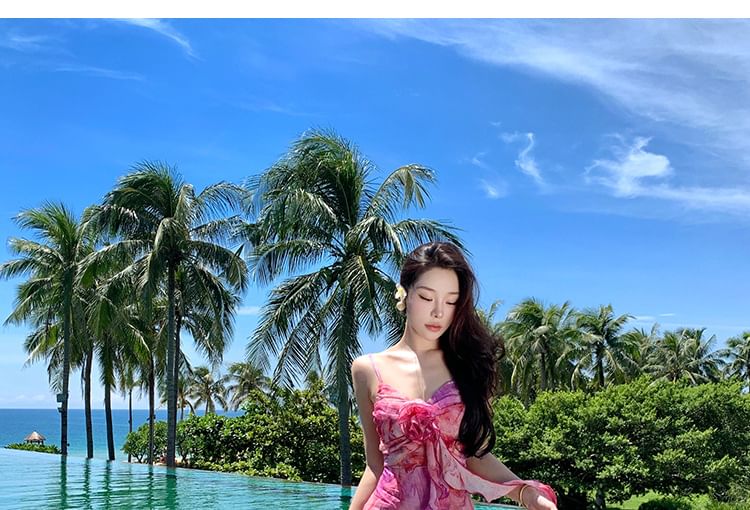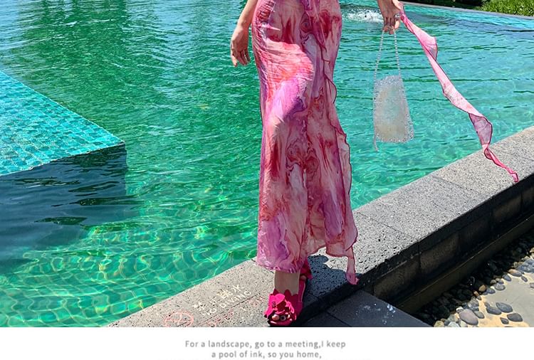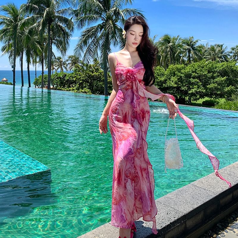 Spaghetti Strap Tie Dye Flower Accent Ruffle Trim Midi A-Line Sundress
