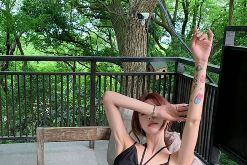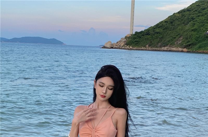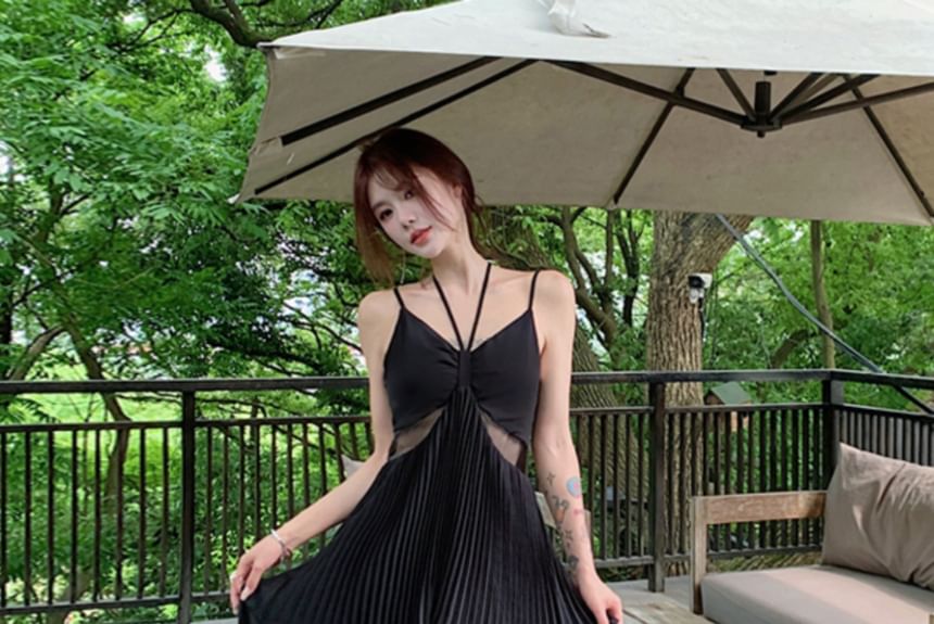 Spaghetti Strap V-Neck Plain Accordion Pleated Panel Mesh Maxi A-Line Dress