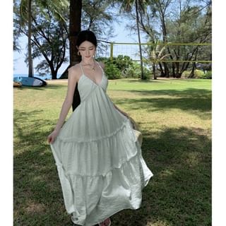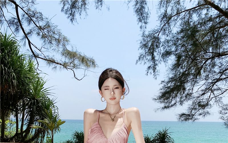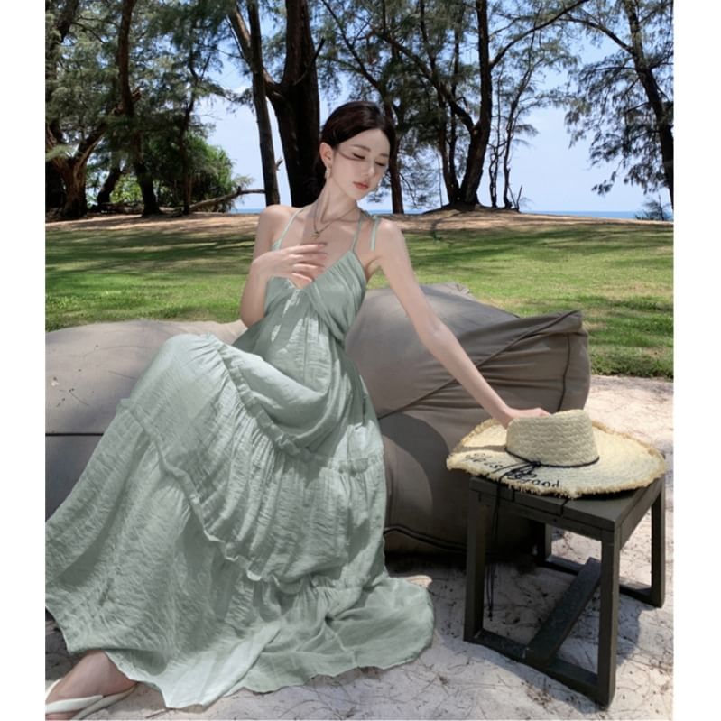 Spaghetti Strap V-Neck Plain Shirred Midi Sundress