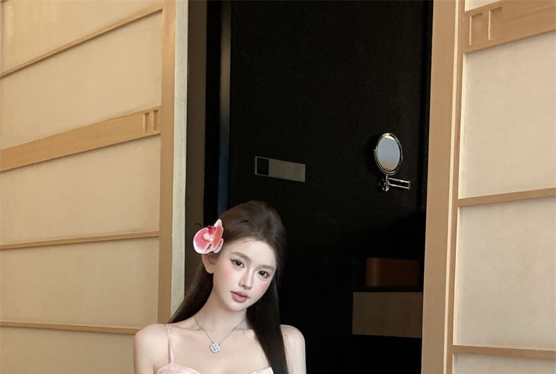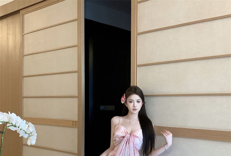 Spaghetti Strap V-Neck Floral Print Ruched Maxi A-Line Dress