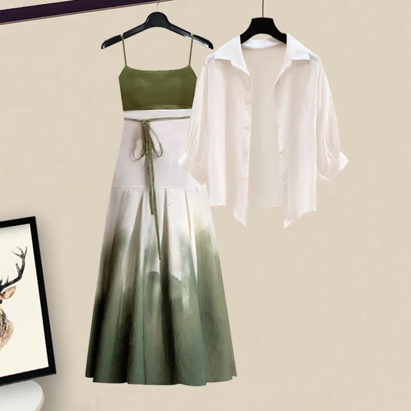 Spring Green Loose Lapel Shirt Vintage Print Slip Dress