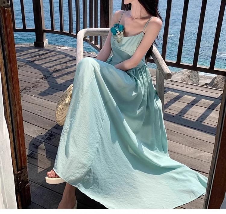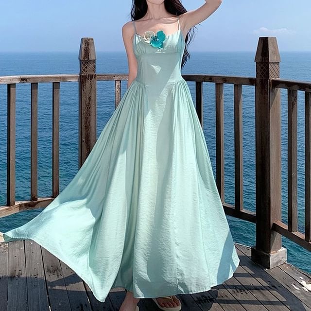 Spaghetti Strap Floral Accent Maxi A-Line Dress