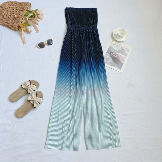 Strapless Gradient Ribbed Wide Leg Jumpsuit