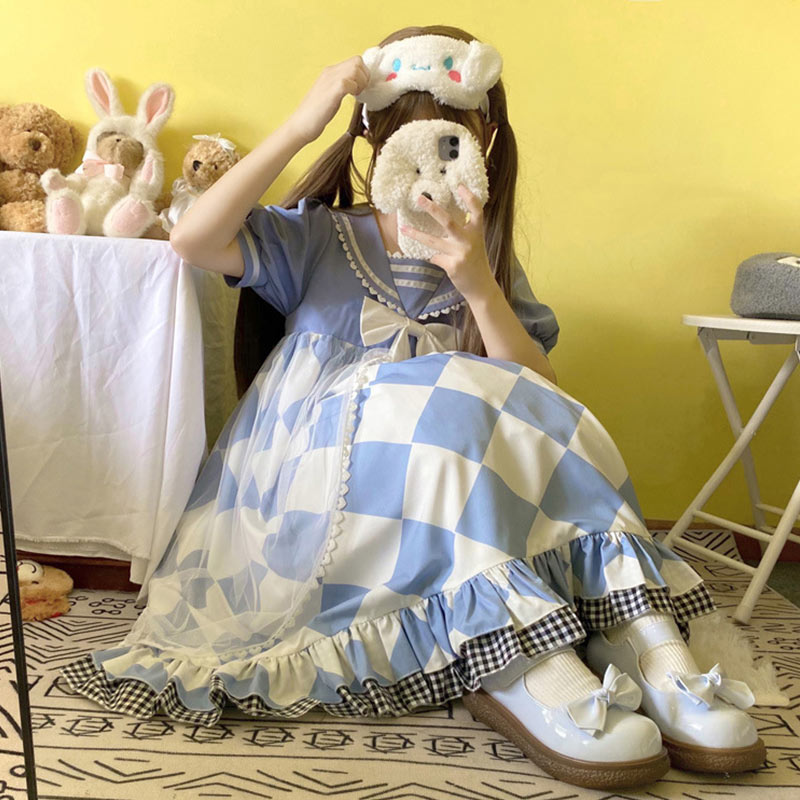 Sweet Bow Square Print Navy Collar Lolita Dress