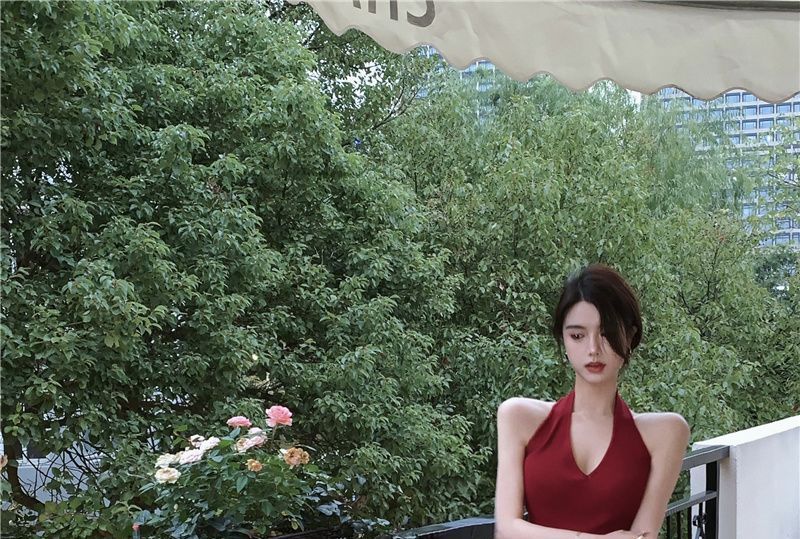 Sleeveless V-Neck Plain Slim-Fit Halter Dress