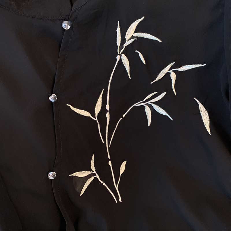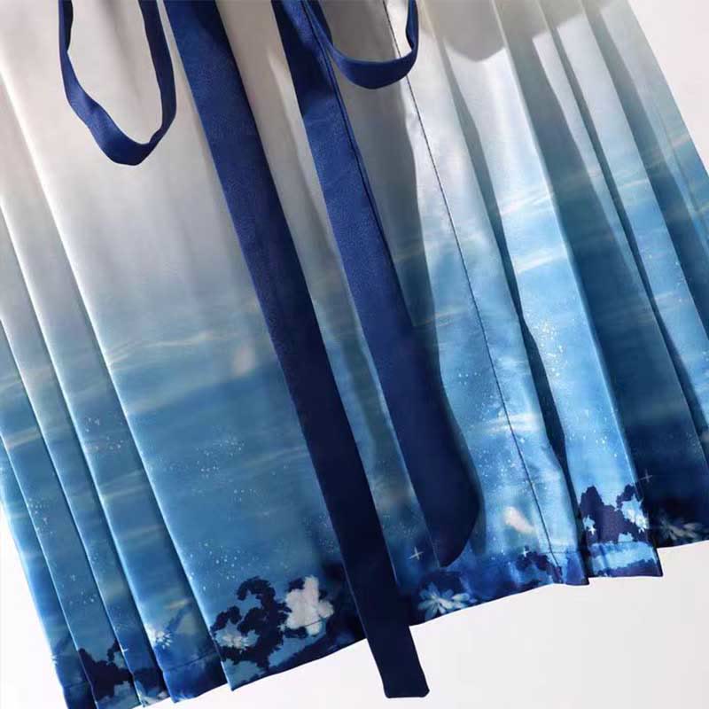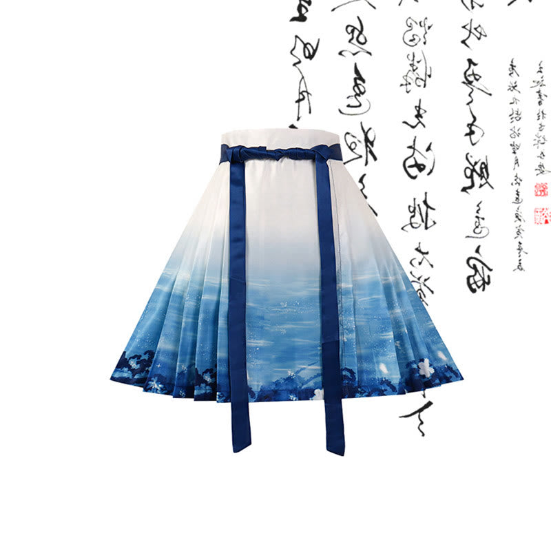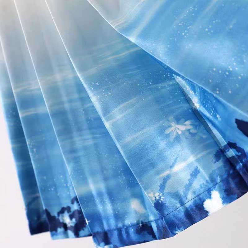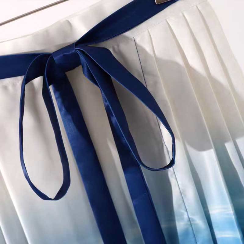 Vintage Buckle Bamboo Print Shirt Blue Pleated Skirt